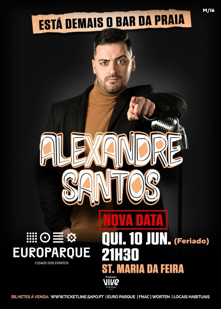 No mesmo dia, 10 de junho, às 21h30, o Grande Auditório do EUROPARQUE recebe Alexandre Santos, com o espetáculo “Está demais o bar da Praia”. O humorista aborda, na primeira pessoa, situações do seu dia-a-dia, tais como a família, o amor e o trabalho. Bilhetes em https://bit.ly/38BdVHK.