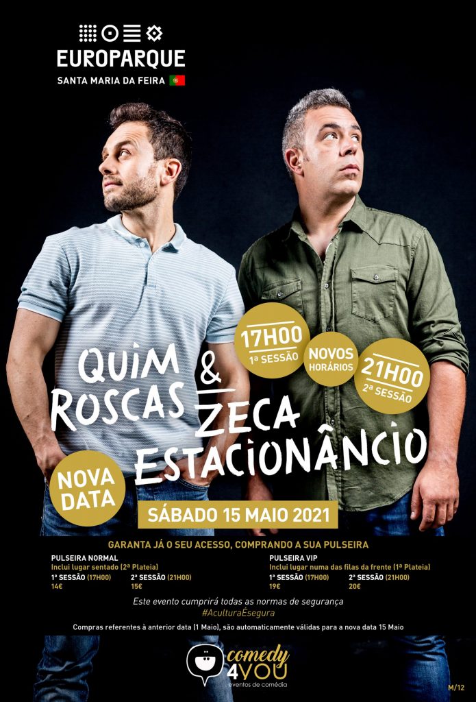 No dia 15 de maio, às 17h00 e às 21h00, o auditório do EUROPARQUE acolhe o espétaculo Quim Roscas & Zeca Estacionâncio. Esperam-se muitas gargalhadas, improvisação e boas energias no espetáculo de comédia, indicado para pessoas dos 12 aos 116 anos. A sessão das 21h00 já está esgotada, mas pode encontrar bilhetes para a sessão das 17h00 aqui https://bit.ly/2QrBcVo.